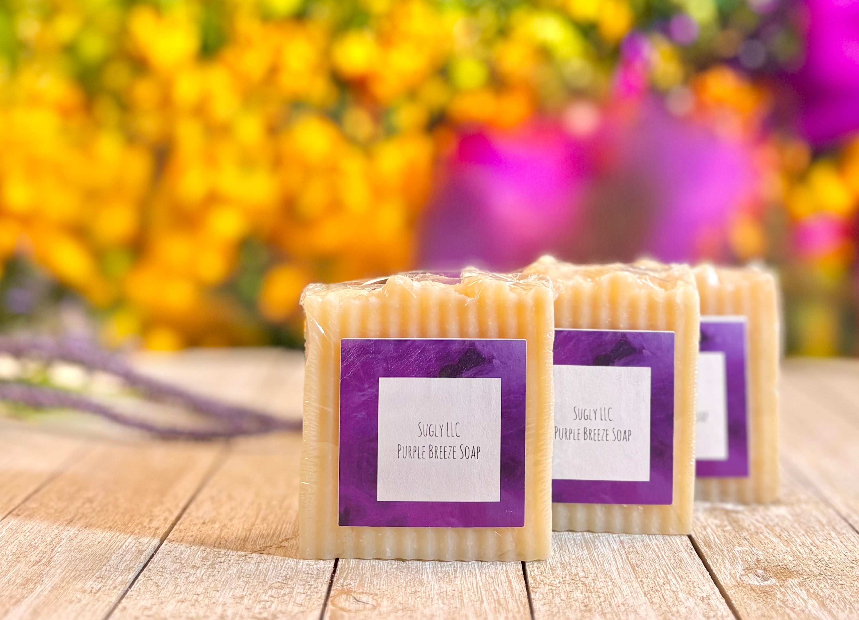 Purple Breeze has hints of sweet lavender. It lathers up like a beauty cream and leaves your skin hydrated. One Purple Breeze Soap Bar of at least 4 oz or Two Purple Breeze Bar Soaps with a combined weight of at least 7 oz. *Don't forget a Soap Cushion to help extend the life of your soap!
